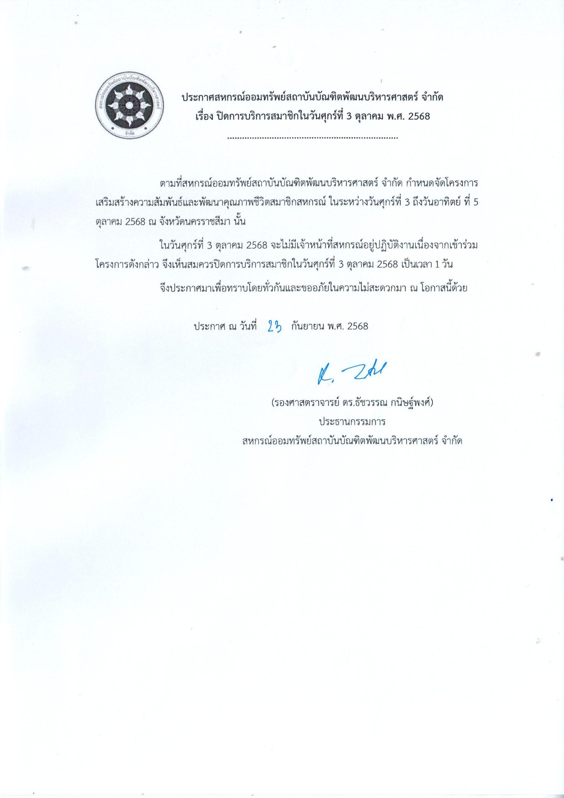 ปิดบริการสมาชิกในวันศุกร์ที่ 3 ตุลาคม 2568